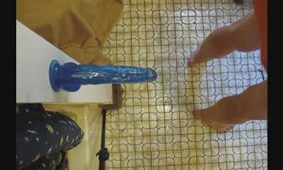 Chastity ladyboy fucks 9 inch wall dildo